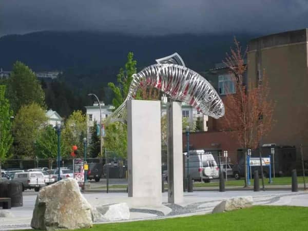鮭魚(yú)或“紅色魚(yú)”(象名Kwikwetlem的意思)的象征意義激發(fā)了廣場(chǎng)上的細(xì)節(jié)和公共藝術(shù)。